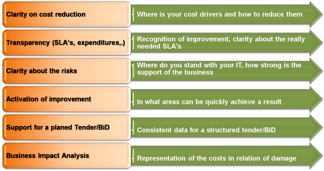 For IT, this creates a complex task that must be addressed in order to be prepared for the rapidly changing needs right out of business. Here is one hand to steer the development of appropriate IT costs while preserving a high quality of IT service provision. On the other hand, IT must support the strategic and operational objectives of the company as part of an IT governance in a flexible and optimal.